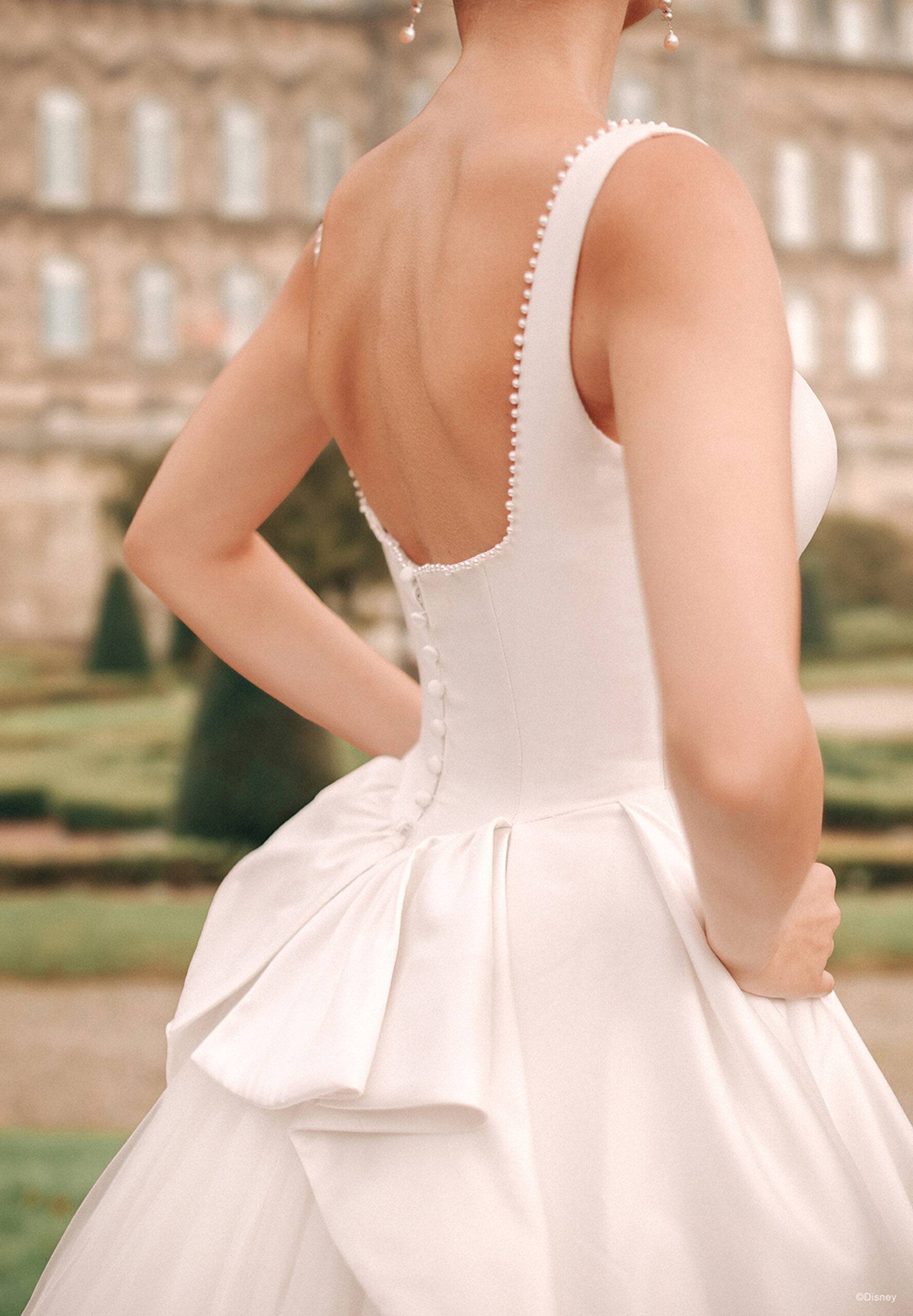 Desde el escote corazón hasta el corpiño con ballenas, este vestido inspirado en Cenicienta presenta cuentas tonales que atraen la mirada al estrecharse a lo largo de la falda, realzada por tul brillante y botones de cristal