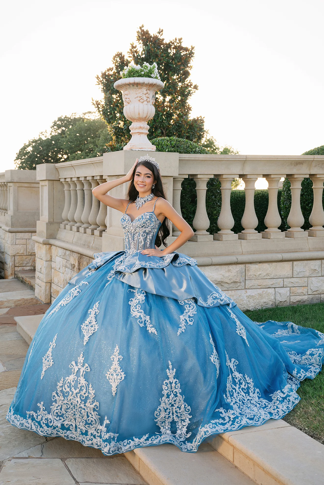 Este vestido es ideal para una temática de princesa de ensueño. Su corte y volumen crean ese efecto mágico y etéreo que toda quinceañera sueña vivir, con un corpiño corazón lleno de brillo y una falda amplia que parece sacada de un cuento, perfecta para sentirse única y espectacular en su gran día.