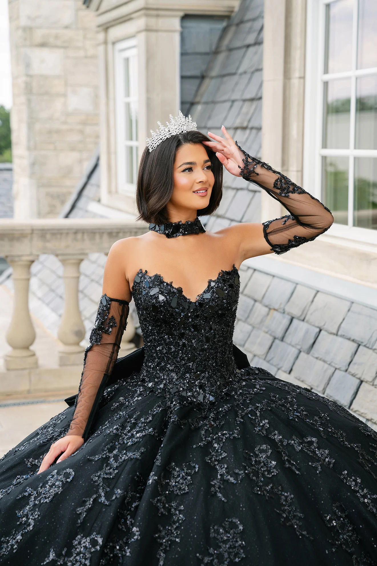 Diseñado para la quinceañera rebelde que ama lo moderno y sueña con ser el centro de todas las miradas. Este vestido deslumbra con un corpiño de cuentas efecto espejo que refleja la luz con fuerza, combinado con una falda de tul brillante que aporta dramatismo y movimiento. El escote corazón y la cintura alta estilizan la figura, mientras los detalles de lentejuelas, mangas desmontables y un lazo extragrande crean un look audaz, poderoso y absolutamente inolvidable para una fiesta de quince moderna y soñada.