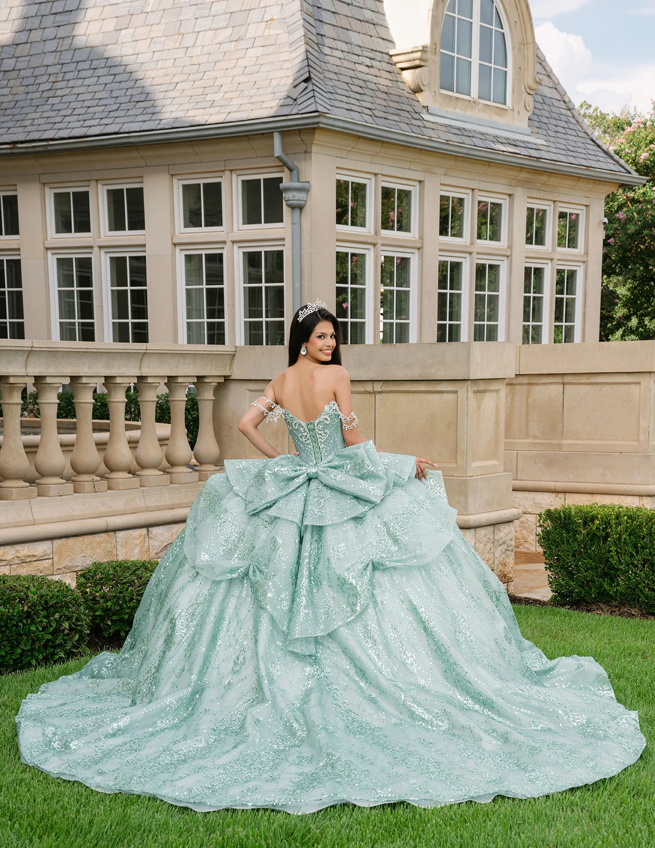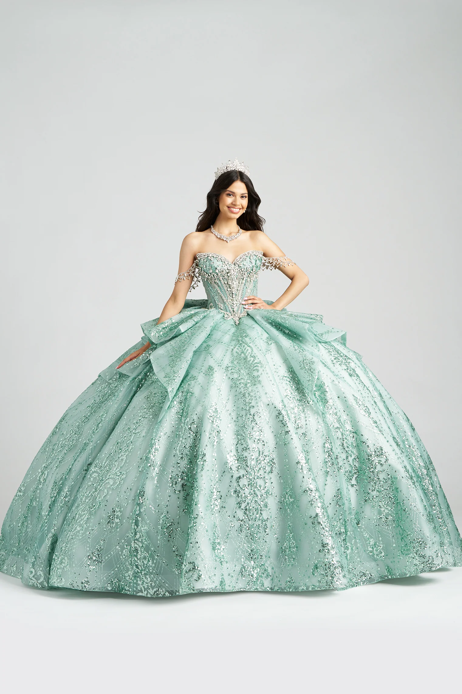 Ideal para una temática de La Sirenita o la princesa Ariel, este vestido es perfecto para un evento al aire libre donde cada destello cobre vida. El corpiño de ojo de gato, cubierto de cristales, estiliza la figura y se funde con una cintura esculpida.  La falda de tul con purpurina brilla con cada paso, creando un efecto mágico, mientras las mangas de cristal desmontables y el lazo espectacular permiten personalizar un look digno de un cuento bajo el mar.