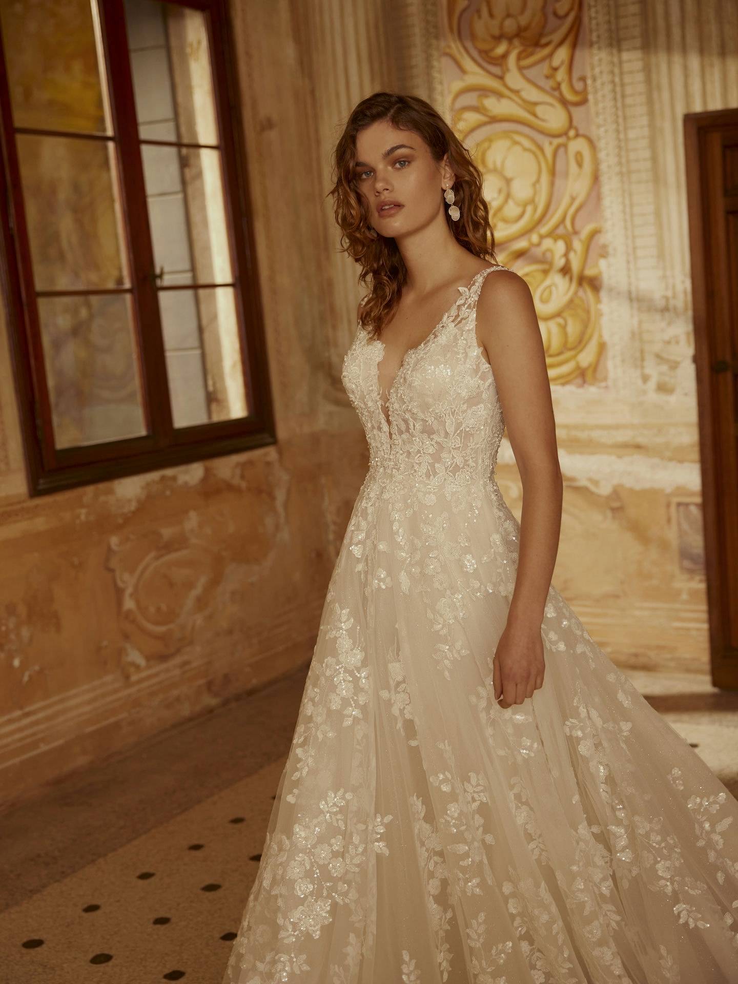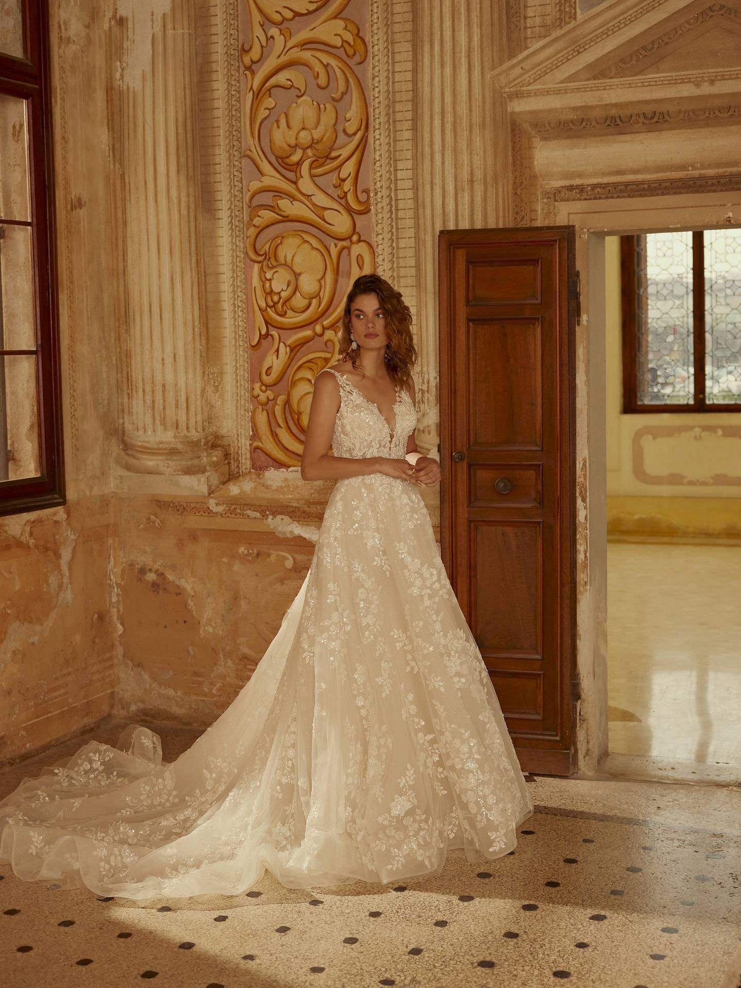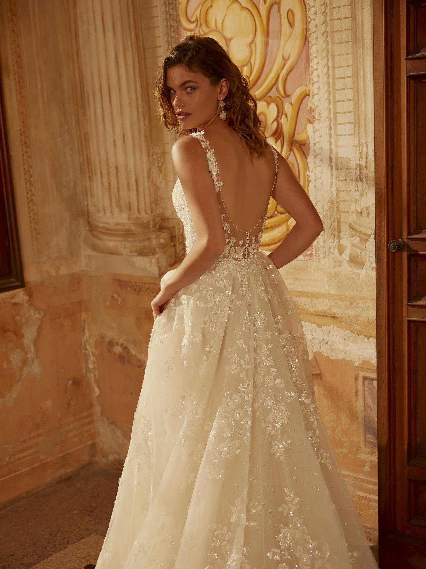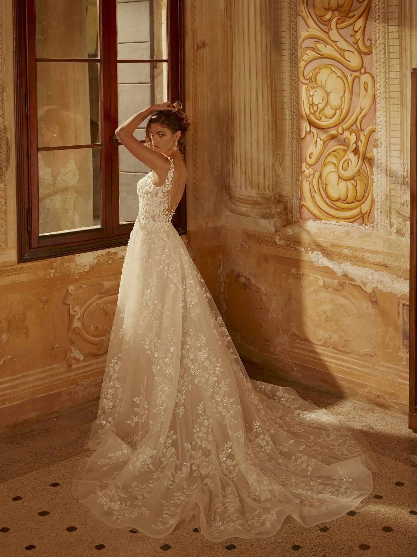 Precioso estilo de encaje con cuello en V que es perfecto para la novia que es lujosa y moderna. El diseño incluye un aplique de encaje con cuentas diseñado ingeniosamente desde la parte superior hasta el tren de la capilla. Una silueta favorecedora en forma de a es el toque final de un vestido fabuloso