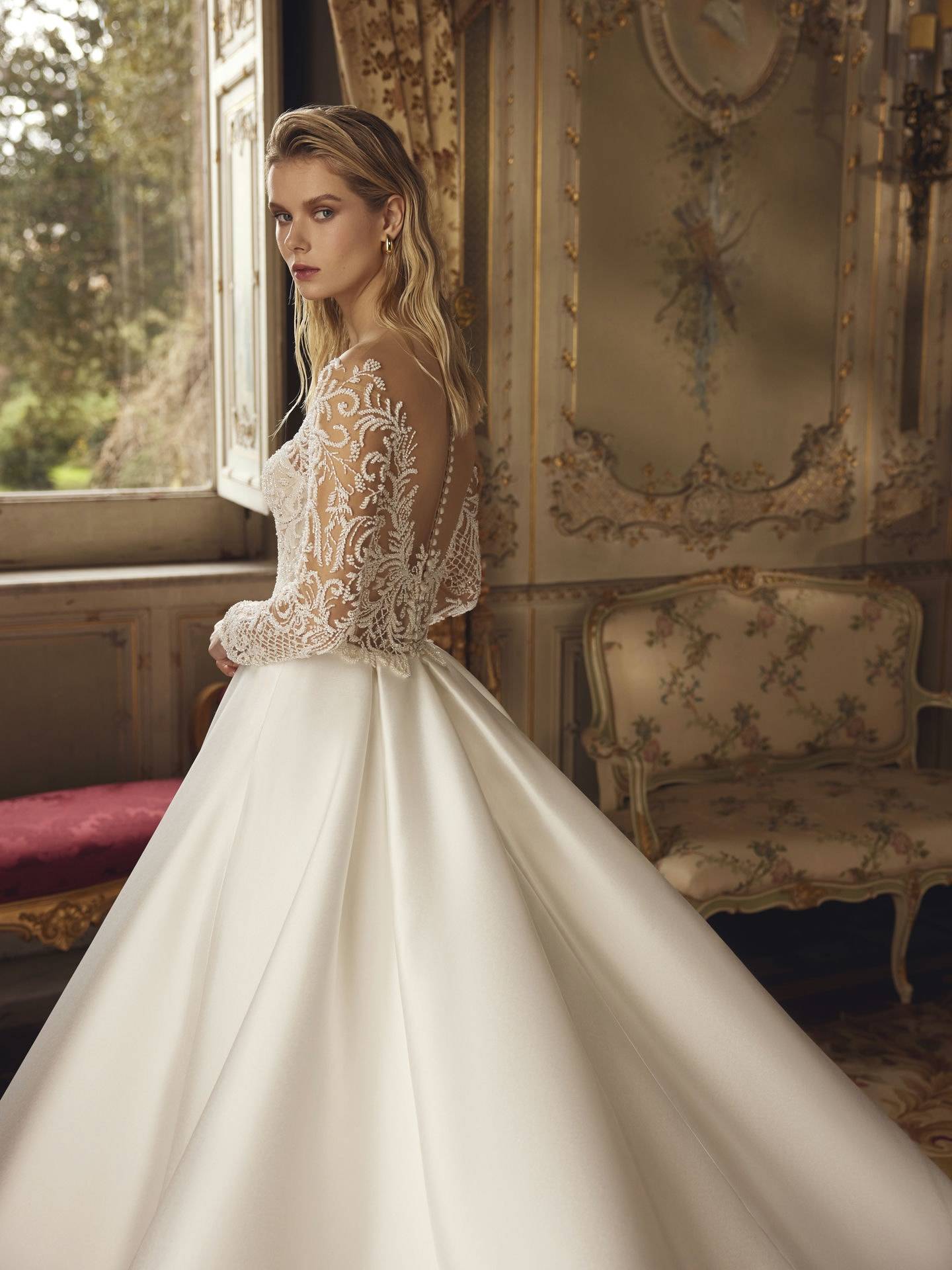 Hecho a mano para la novia a la moda que encarna el estilo y el glamour, el vestido de línea a de mikado completo presenta un corpiño de manga larga con cuentas con bordados intrincados, un escote ilusión que revela elegantemente los hombros y la espalda.