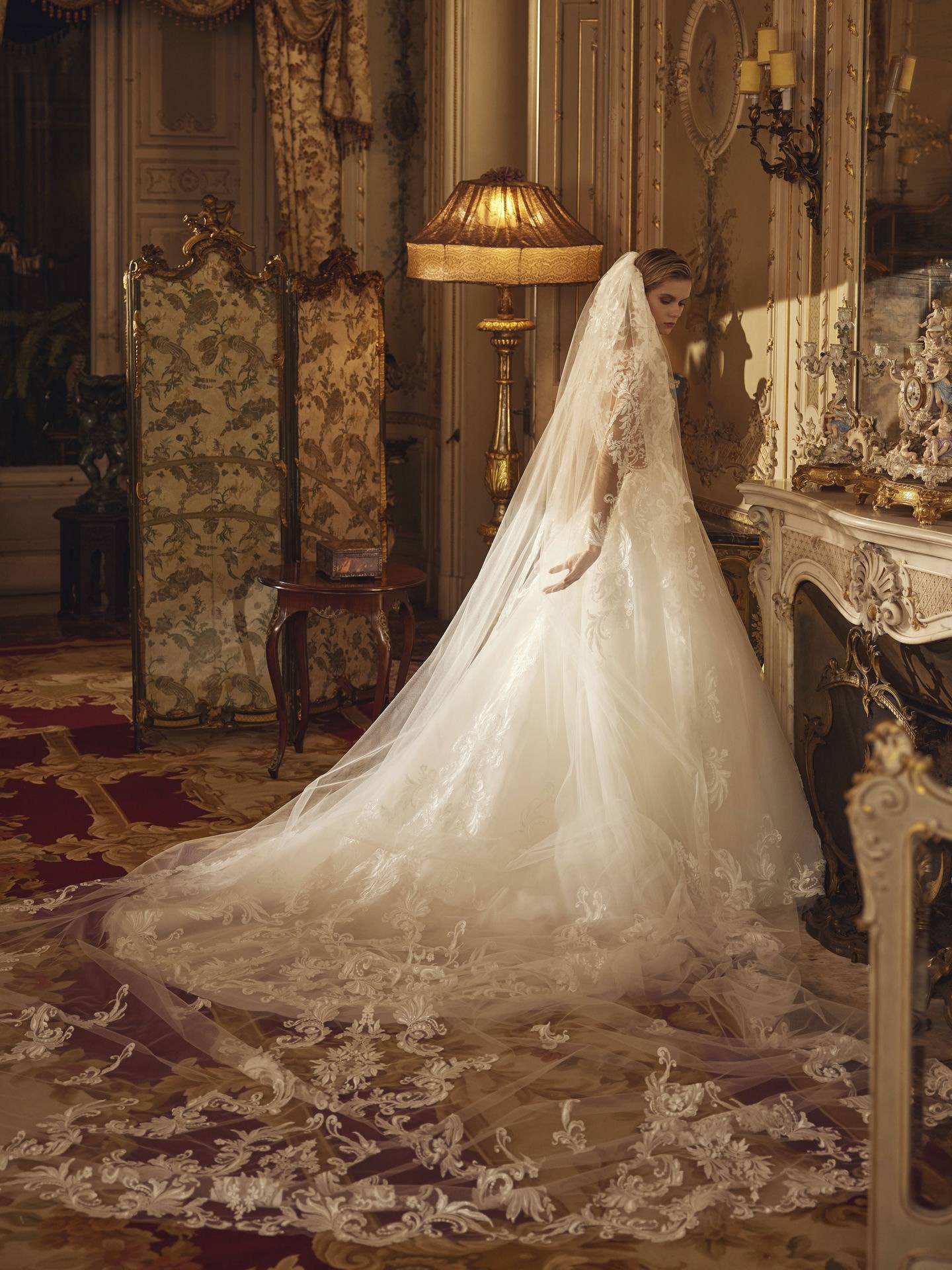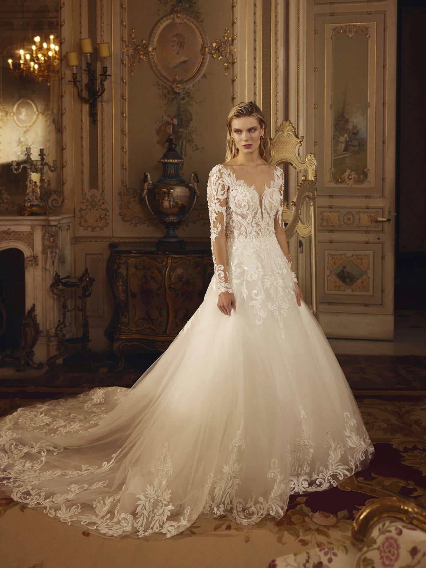 Este vestido cuenta con encaje de cuentas de inspiración vintage acentúa el escote abierto y las mangas largas transparentes, fluyendo elegantemente desde el corpiño hasta el lujoso diseño de línea A. La espalda está adornada con un impresionante motivo de encaje con efecto tatuaje, complementado con un cierre de botón.