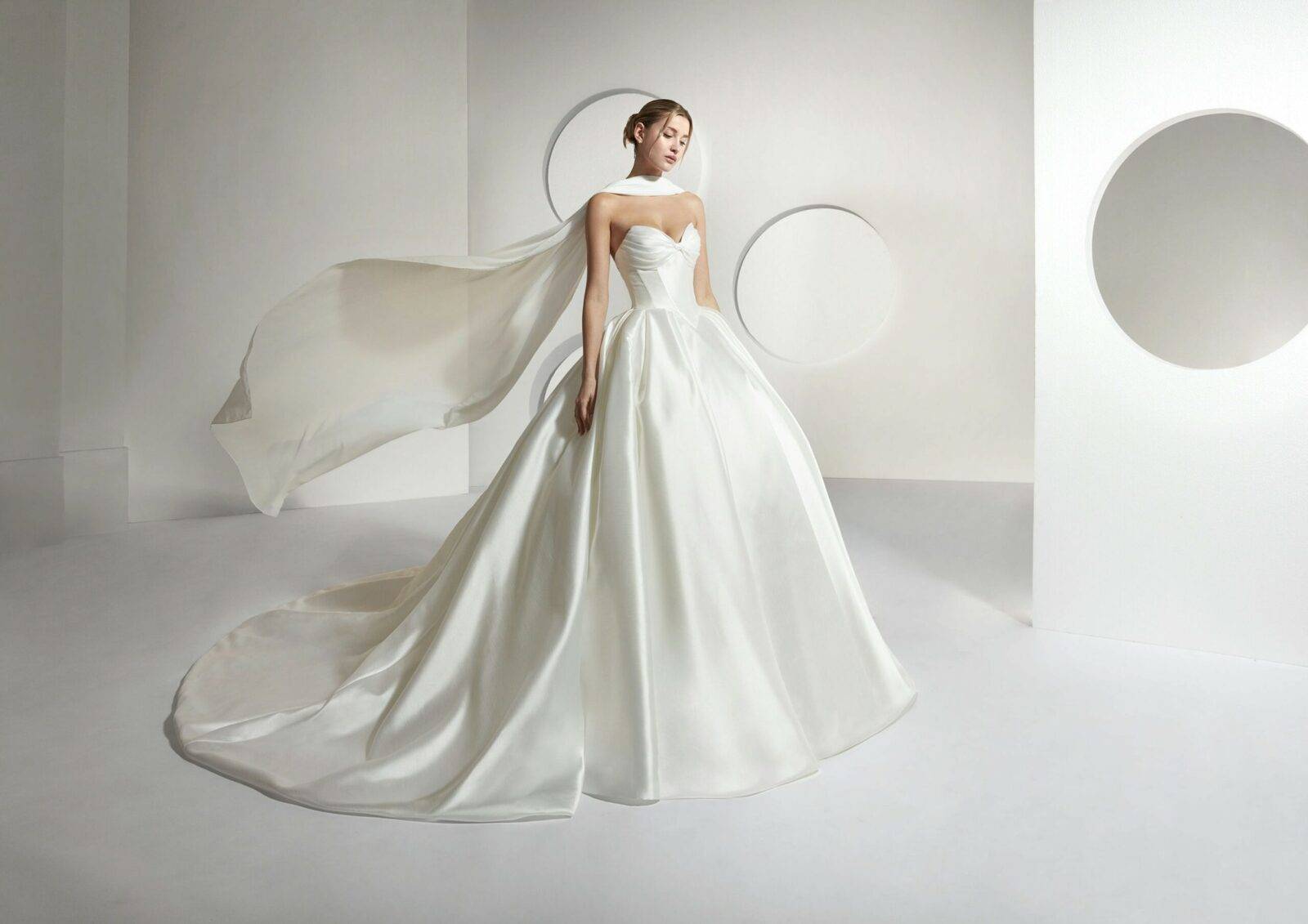 El minimalismo y el maximalismo se mezclan a la perfección en esta impresionante obra maestra de tafetán. Con copas fruncidas, una cintura vasca sumergida y una voluminosa falda de vestido de fiesta, este vestido es el epítome de la perfección. La colección Alta Moda está hecha a medida para novias con un gran sentido del diseño, haciendo declaraciones audaces y abrazando el lujo.