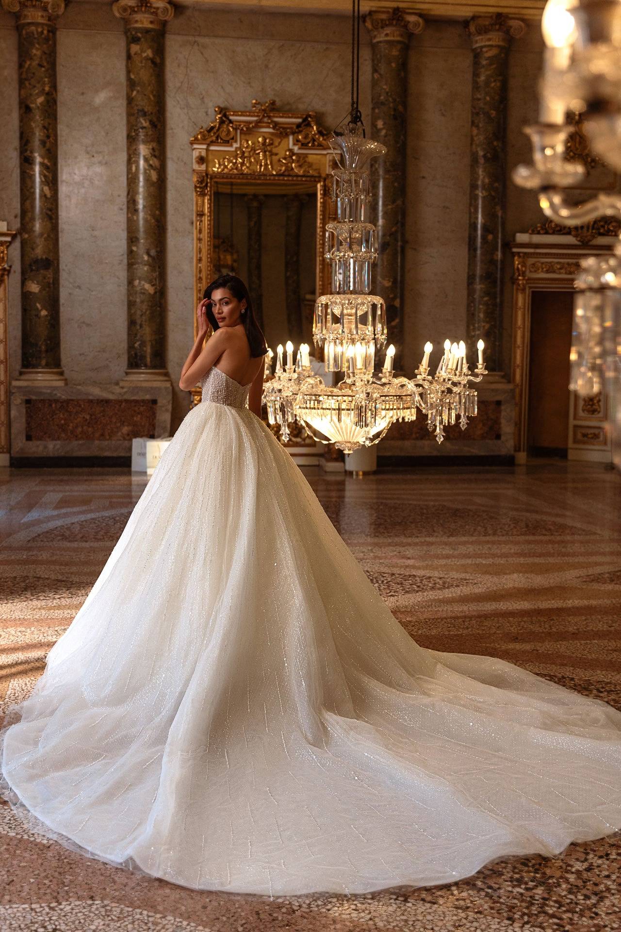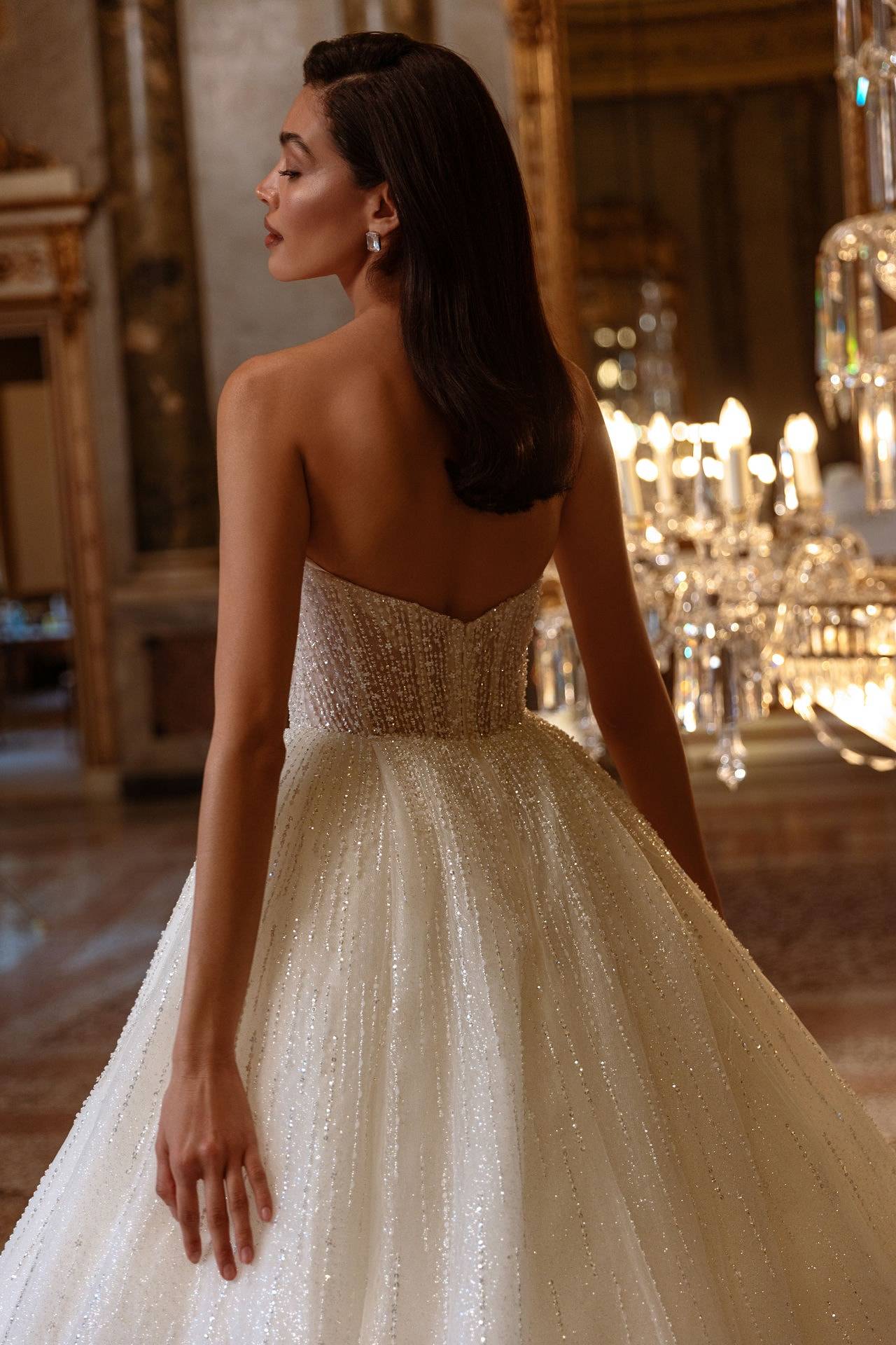 La princesa de cuento de hadas se encuentra con el glamour de Hollywood con el vestido de novia Lumina. Con un escote sin tirantes, pedrería brillante y tul de ensueño, este vestido es un sueño hecho realidad.