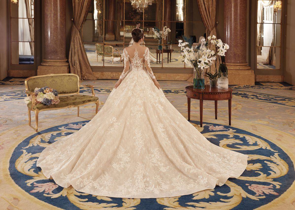 Extravagante pero clásico define a la cautivadora Celia. El encaje con cuentas decadentes resalta el escote ilusión fuera de los hombros y las mangas largas transparentes y las cascadas desde el corpiño hasta la lujosa falda de organza Ball. Un magnífico motivo de encaje con efecto de tatuaje adorna la espalda con cierre de botón. Un impresionante tren desmontable transparente adornado con encaje añade un gran toque.