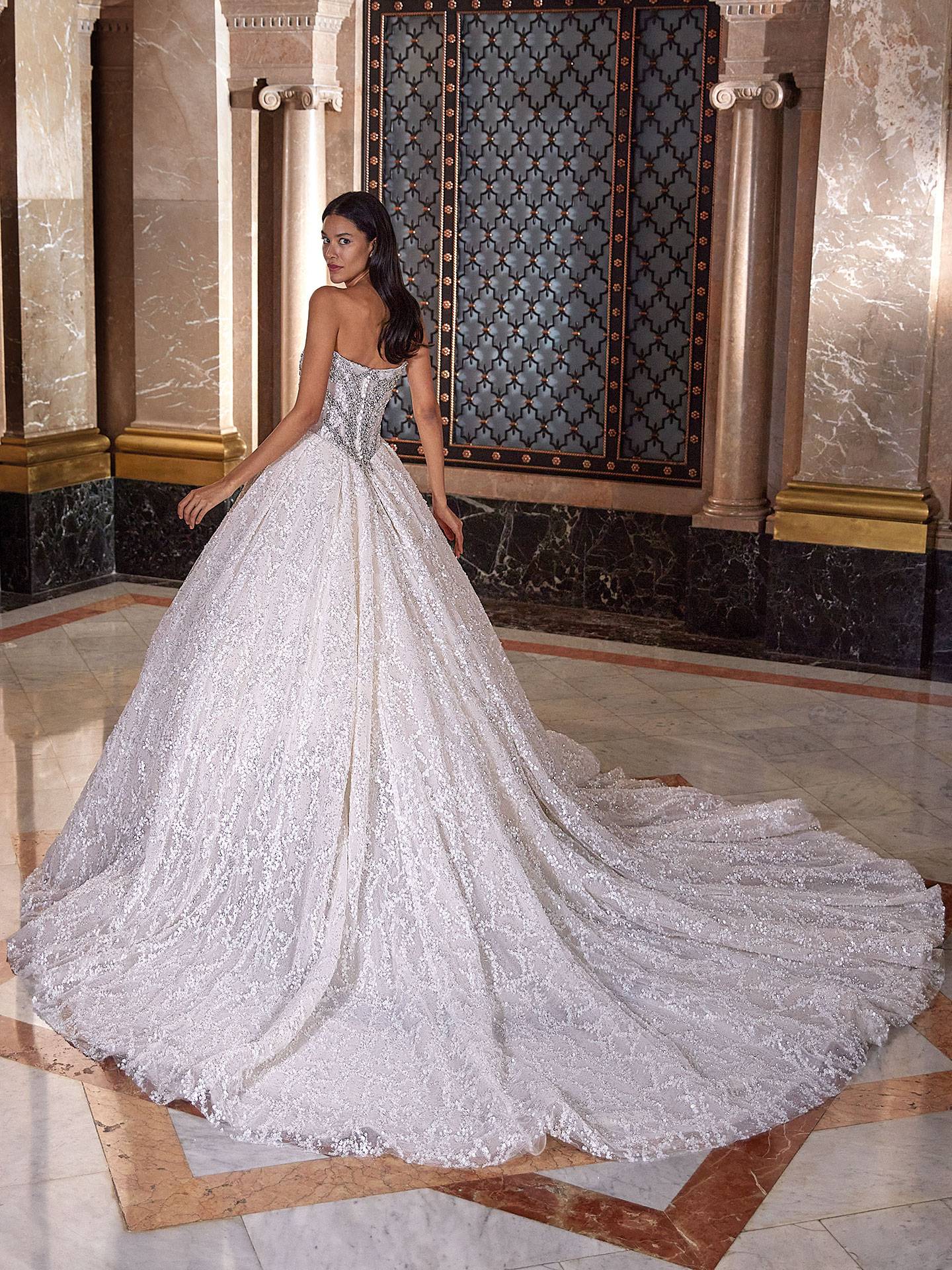 Audaz e impresionante, el vestido Diamara es una celebración del glamour de declaración y el alto drama nupcial. El escote sin tirantes está acentuado por intrincados pedrería de chevron, que conduce a una voluminosa falda de vestido de fiesta hecha de tul brillante con cuentas brillantes