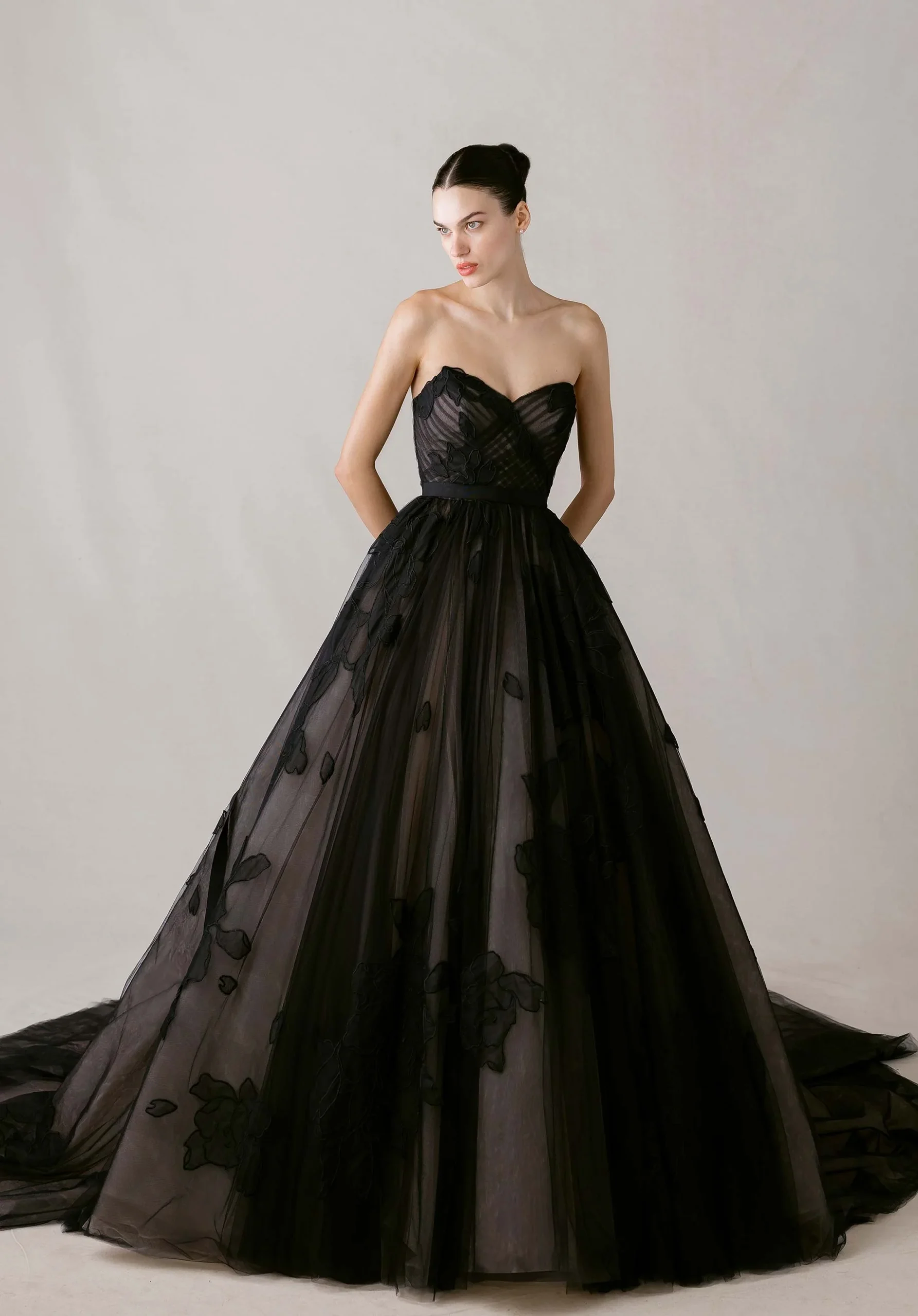 Audaz, sofisticado y fuera de lo convencional. Este vestido de novia negro es para quienes desean romper con lo tradicional y hacer de su boda una declaración de estilo. Su corte A y escote de ojo de gato sin tirantes resaltan la silueta sobre un corpiño tipo corsé transparente, mientras que el cuello alto desmontable y la chaqueta de ilusión de manga larga en tul, adornada con flores de organza, aportan un dramatismo elegante. La cinturilla de satén desmontable permite personalizar el look y hacerlo tan único como tu historia.