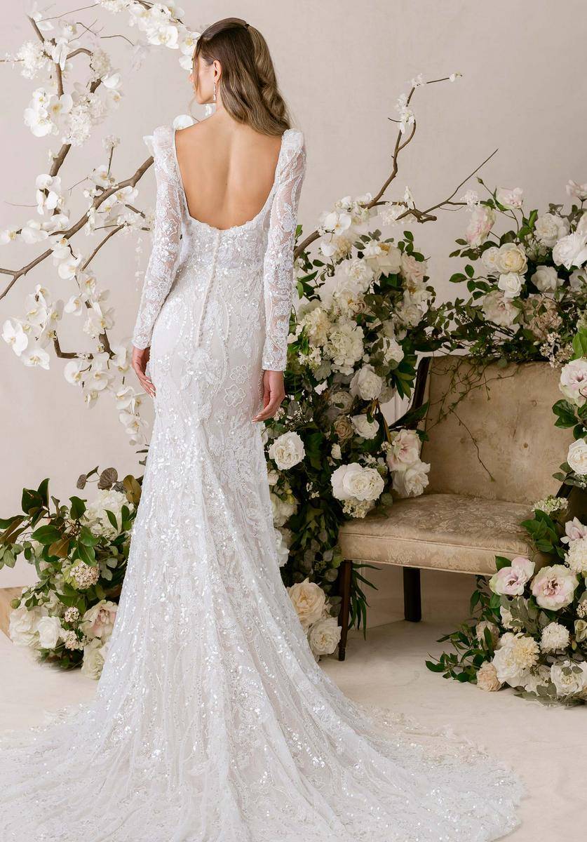 Diseñado para brillar en bodas en interiores, este vestido es perfecto para una novia que quiere que su momento sea el centro de atención. El encaje y la pedrería capturan la luz con cada movimiento, creando una sensación de elegancia, porte y sofisticación absoluta. Al llevarlo, te sentirás radiante, segura y protagonista, envuelta en un brillo delicado que transforma cada mirada en admiración.