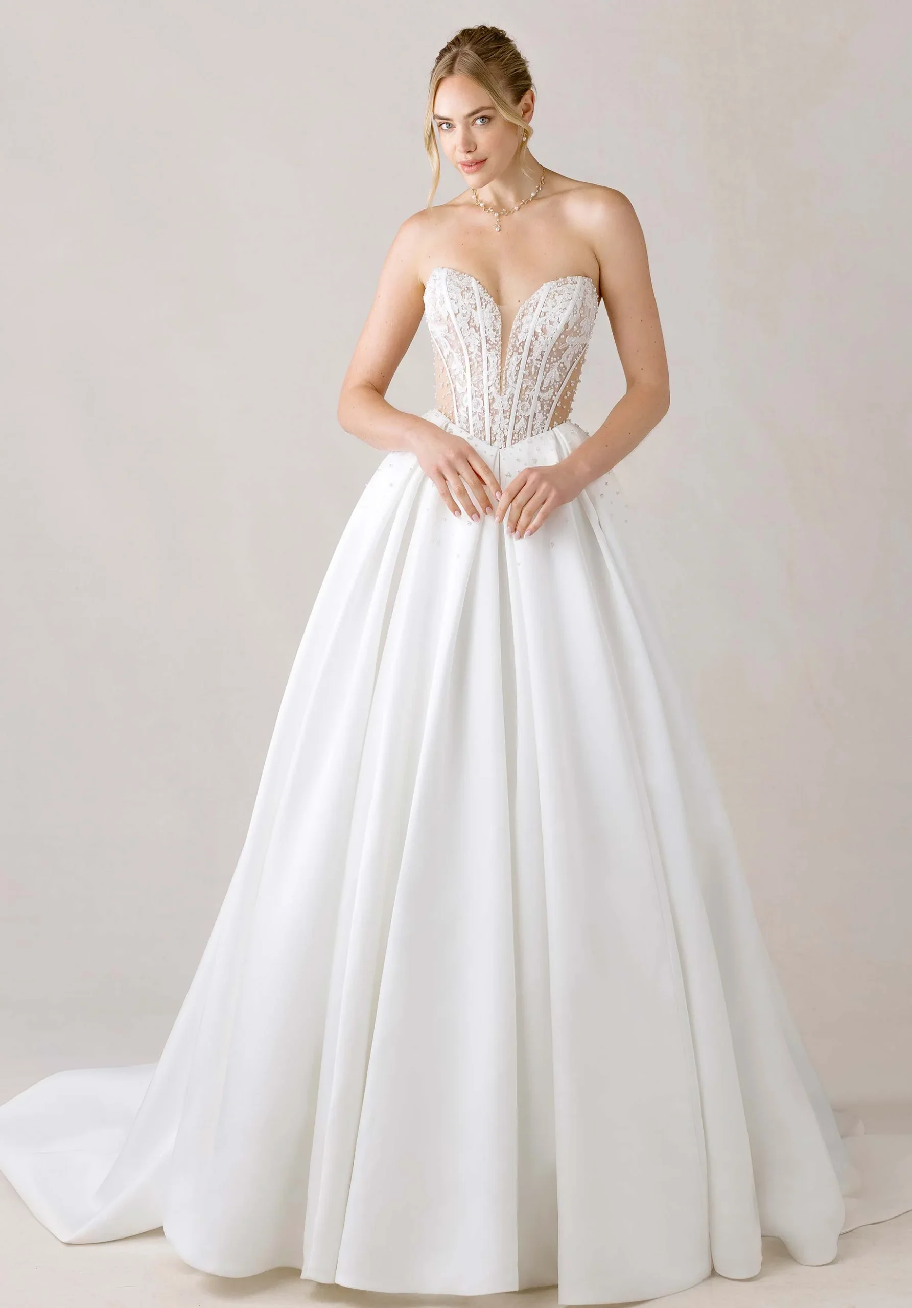 Sutil y romántico, este vestido es perfecto para novias que aman los detalles minimalistas. El corset con destellos delicados aporta un brillo elegante, mientras la falda lisa crea una silueta limpia y atemporal. Ideal para una ceremonia frente a un lago, donde la calma y la belleza natural acompañan cada paso.