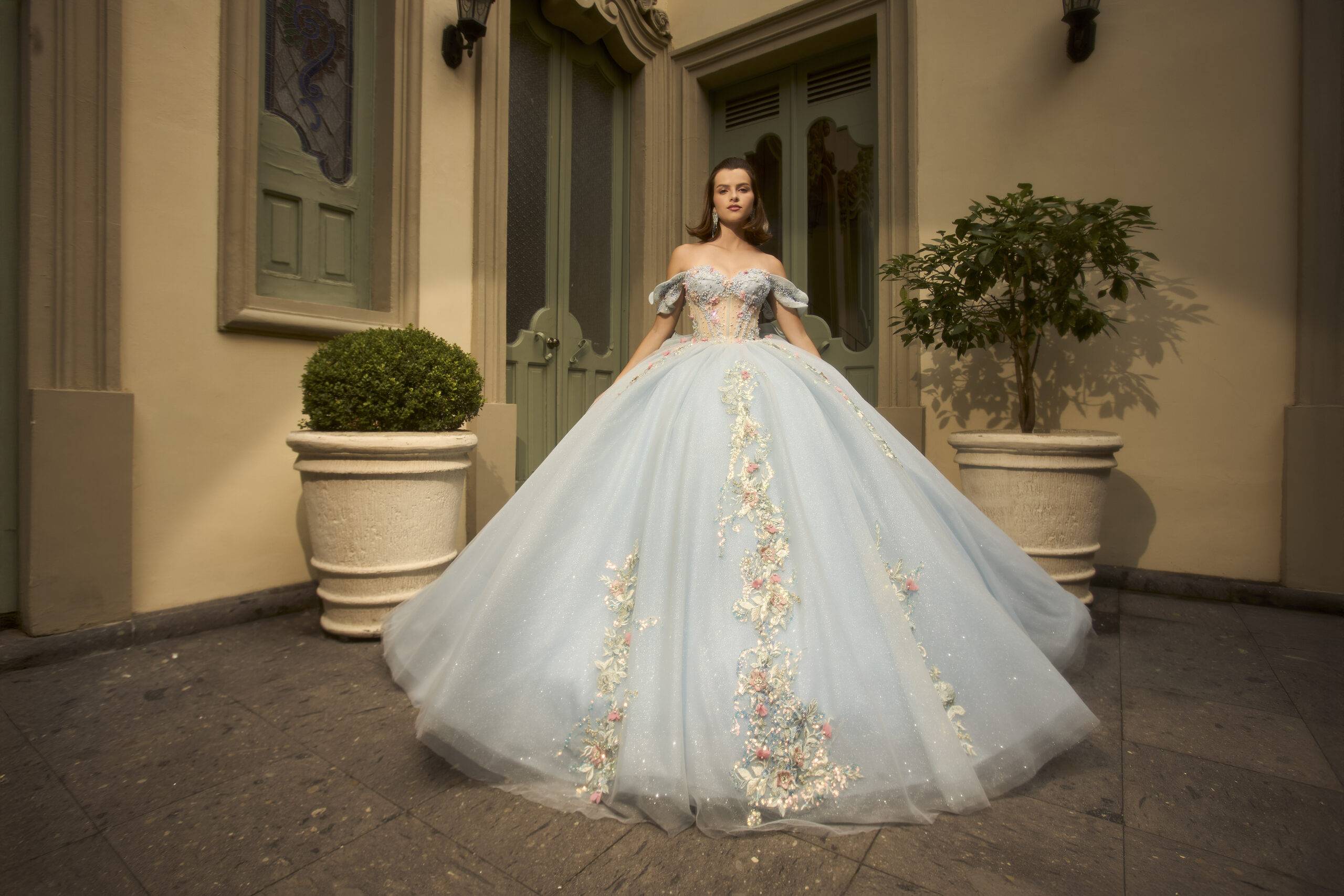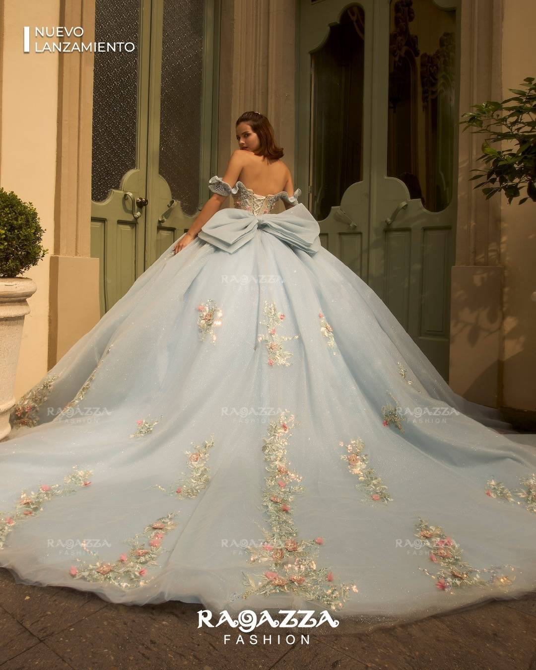 Dulce y delicado, este diseño en celeste pastel refleja un estilo tradicional lleno de encanto. Su silueta clásica y acabado suave crean una presencia elegante y armoniosa, haciéndote sentir especial, segura y protagonista de un momento inolvidable.